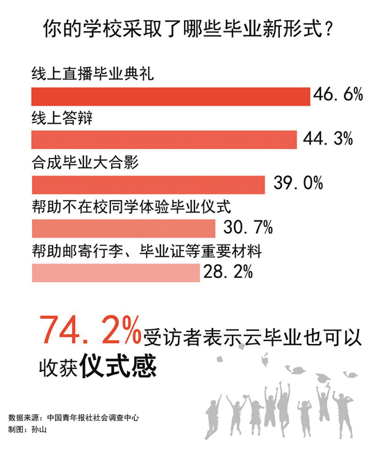 近日,中国青年报社社会调查中心联合问卷网(wenjuan.com),对1130名受访者进行的一项调查显示,74.2%的受访者表示云毕业也可以收获仪式感。62.1%的受访者表示通过云毕业,自己收获了特别的毕业体验。50.4%的受访者更加珍视同学间的友谊与约定。